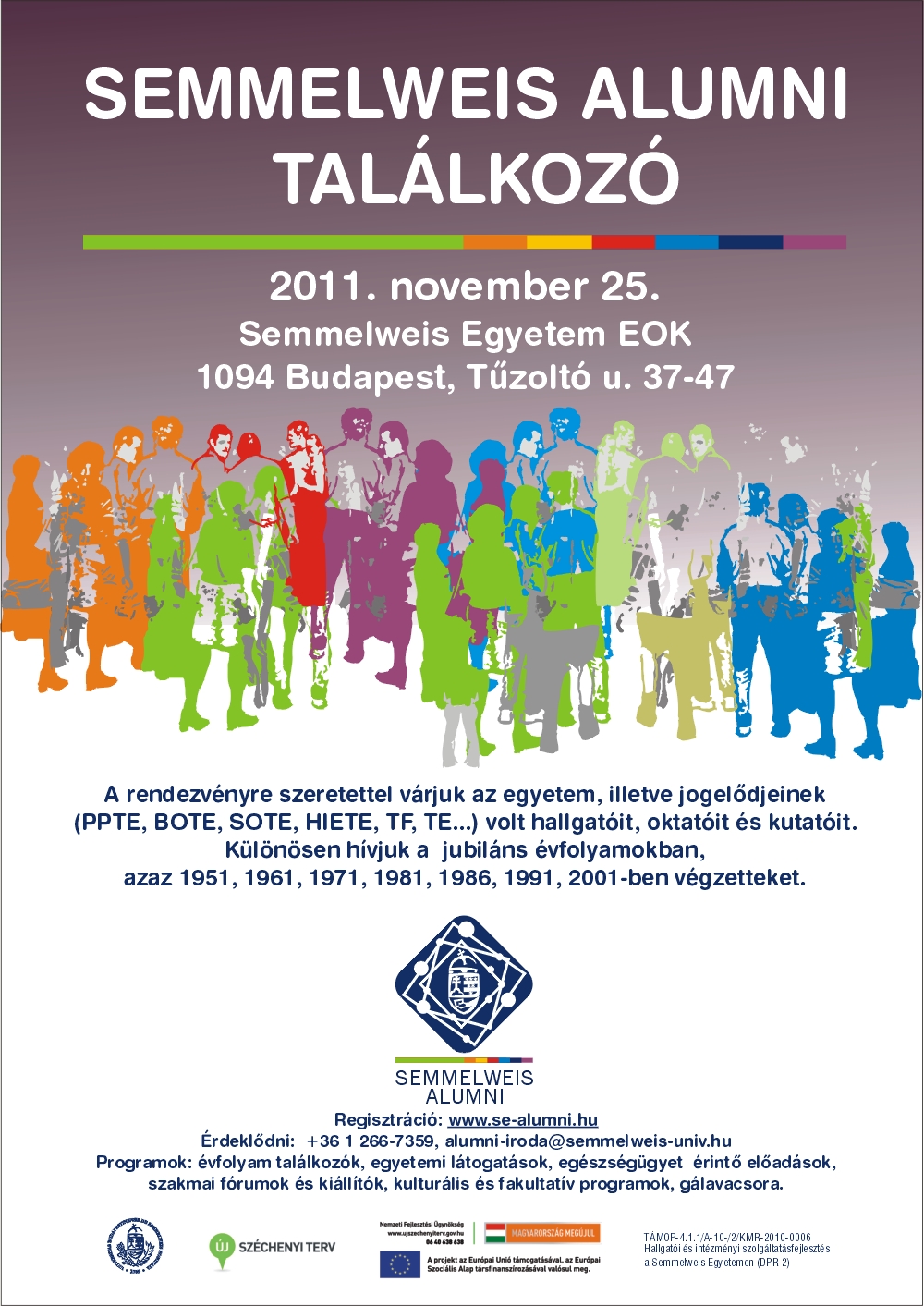 A kapcsolattartást szolgáló és regisztráció céljából is kérjük, látogassák a http://alumni.semmelweis-egyetem.hu oldalt. Bízunk abban, hogy viszontlátjuk Önöket a 2011. November 25-én tartandó Alumni Találkozón.