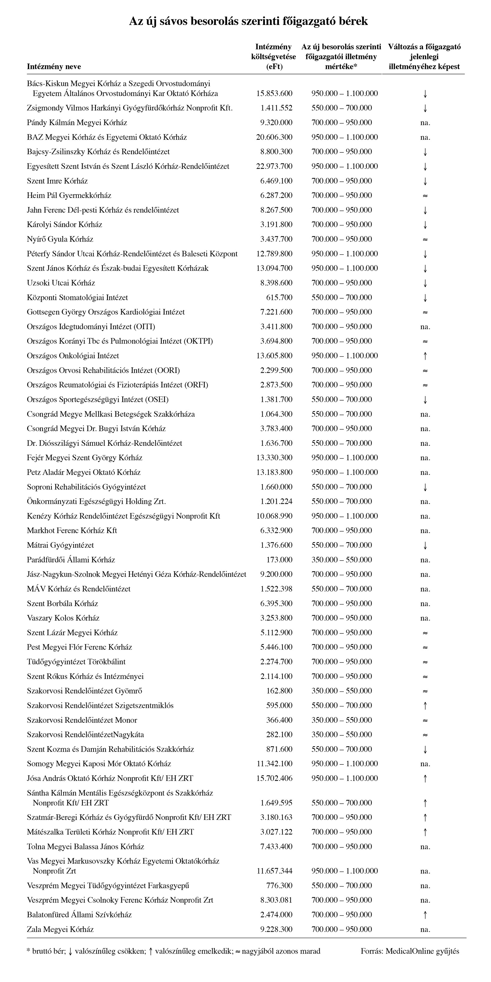 Természetesen a most formálódó kapacitáselosztás, illetve a területi ellátási kötelezettség mértéke nagyban befolyásolja a jövőben az egyes egészségügyi intézmények költségvetését, így egyelőre csak a pillanatnyi adatok elemzése alapján lehet némi következtetést levonni. Összegyűjtöttük a GYEMSZI fennhatósága alatt működő intézmények adatait, és néhány kórház, szakrendelő esetén a főigazgatói illetmények mértékét. A táblázatból jól látható, hogy ki, milyen mértékű jövedelemre számíthat, valamint jelöltük azt is, hogy a rendelkezésünkre álló adatok szerint csökken, nő, vagy a jelenlegi szinten maradhat a főigazgató illetménye.