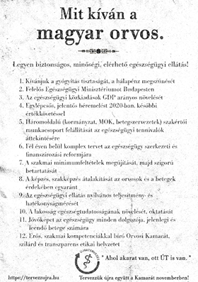 Bár az érkezők hangulata nem volt forradalmi, az épület bejáratánál az Újratervezés csoport tagjai az 1848-as forradalom 12 pontjának mintájára „Mit kíván a magyar orvos” címmel összefoglalt követeléseiket osztogatták a belépőknek. Az épületben, a MOK regisztrációs asztalánál fehér és piros lapokat kaptak az orvosok, akiknek bár a hozzászólás vagy a kérdezés jogát nem adták meg, de kifejezhették egyetértésüket a fehér, nemtetszésüket pedig a piros papír felmutatásával; ez utóbbinak több szerep jutott.