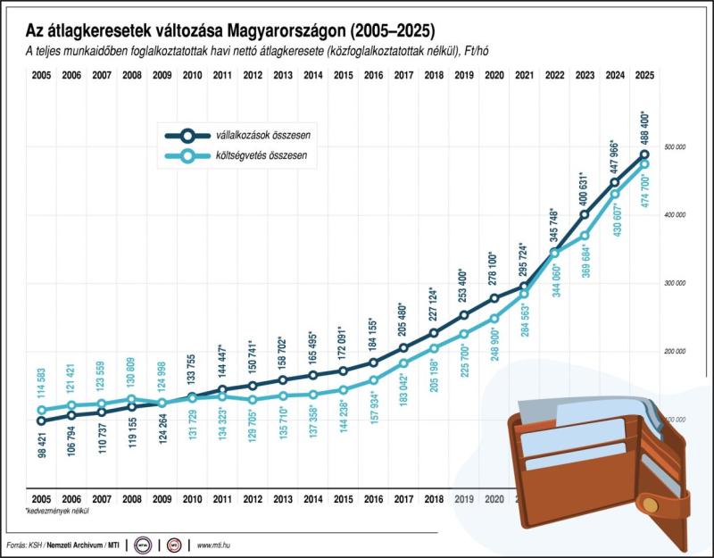 2025. január-decemberben a teljes munkaidőben alkalmazásban állók bruttó átlagkeresete 705 000 forint, a nettó átlagkeresete 486 800 forint volt. A bruttó átlagkereset 9,0 százalékkal, míg a nettó átlagkereset 9,4 százalékkal haladta meg az előző év adatát.