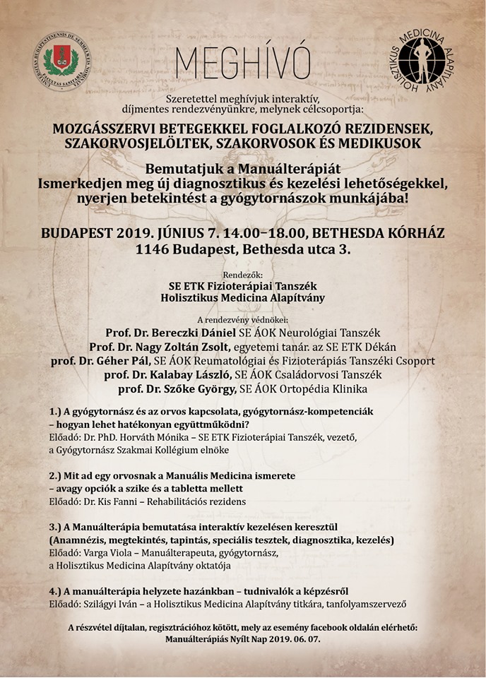 Mozgásszervi betegekkel foglalkozó rezidenseket, szakorvosokat és medikusokat is várnak a június 7-i nyílt napra, ahol a manuálterápiát mutatják be.